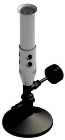 Mechero de alta combustión, base de hierro fundido y tubo de aluminio; con ajuste para entrada de oxígeno y altura de llama controlable mediante regulador de flujo de gas.